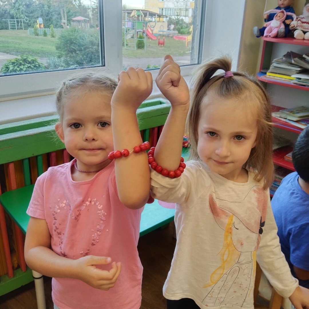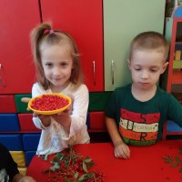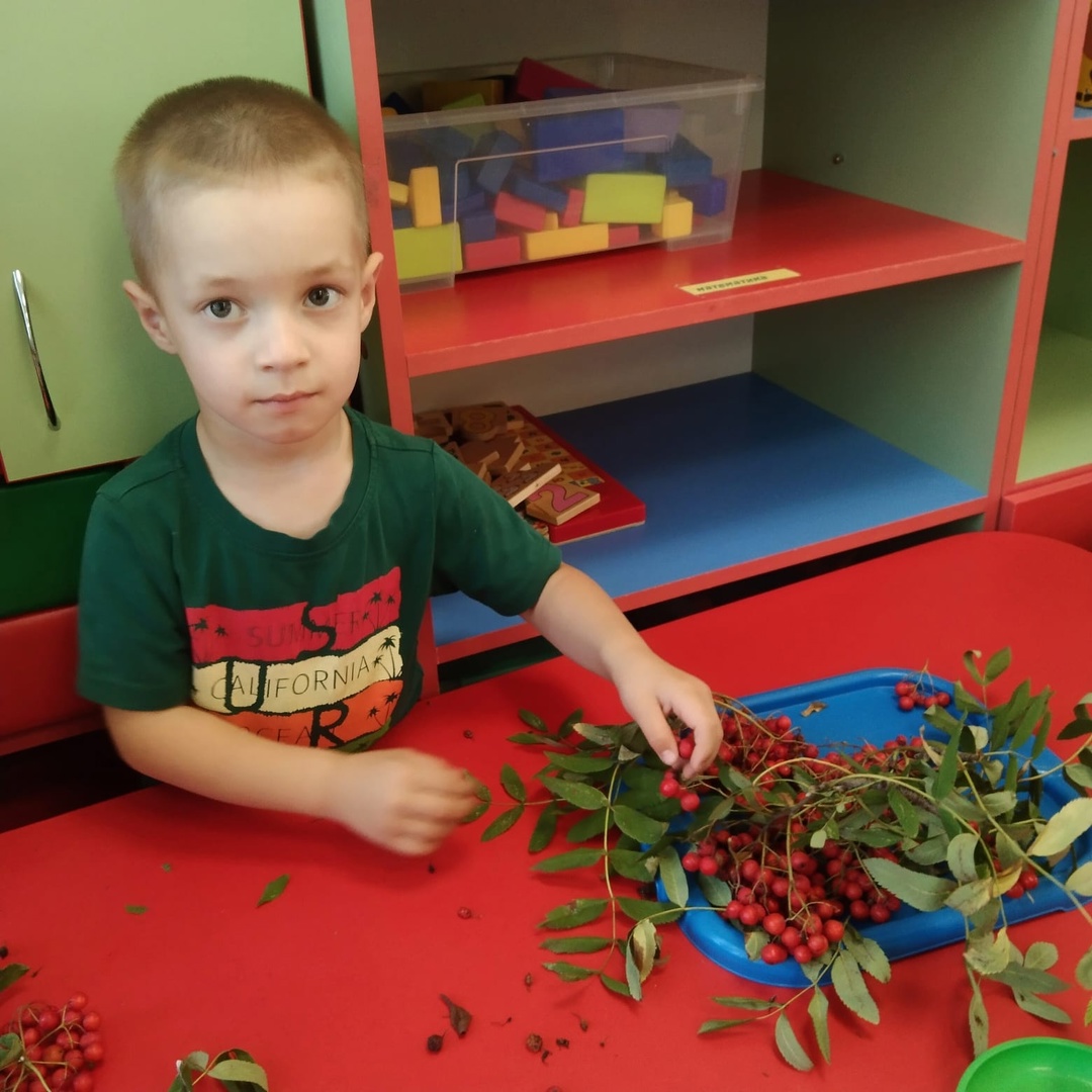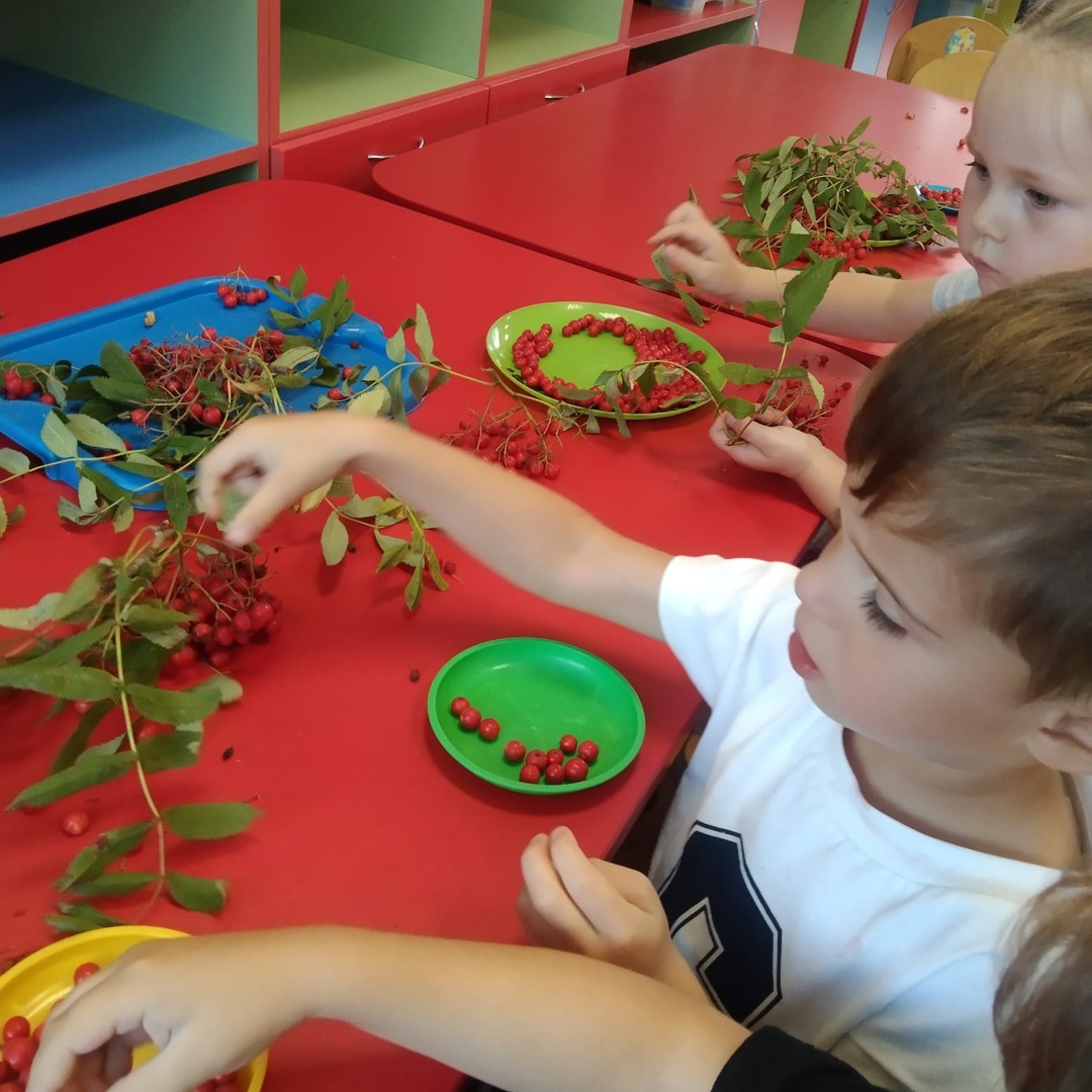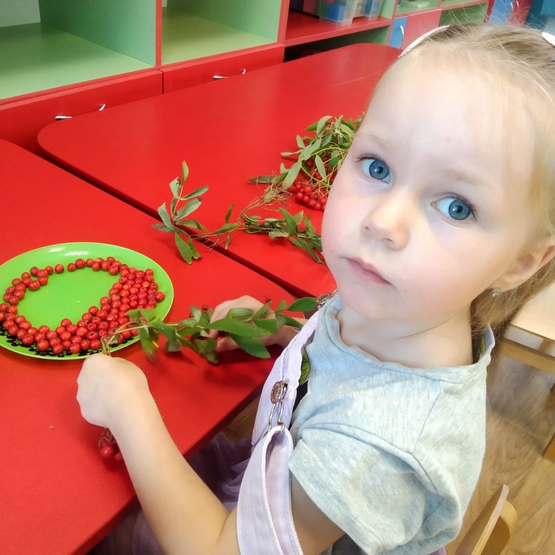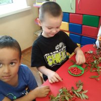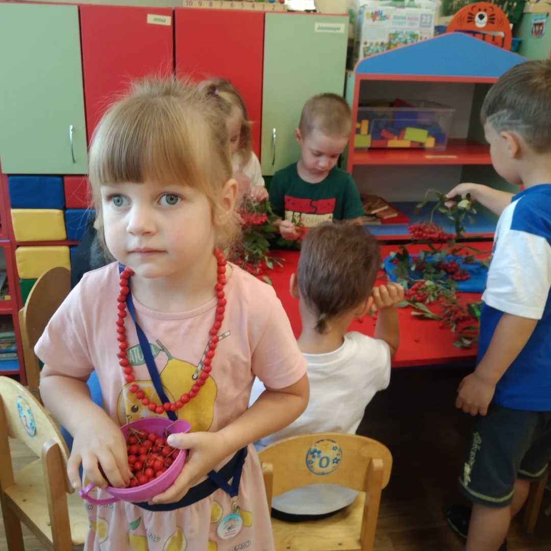 Дети из группы "Незабудки" сделали бусы и браслетики из рябины, которые можно высушить и зимой угощать птичек ягодой.